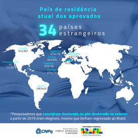 O programa Conhecimento Brasil trará de volta ao país cientistas brasileiros que atualmente residem em 34 países de todos os continentes. A maior parte deles virá dos Estados Unidos (12,8%), da Alemanha (7,3%), da França (4,6%), de Portugal e da Inglaterra (4,1% cada), onde alguns atuam em instituições de prestígio, como Harvard, Karlsruhe, Oxford, Cambridge, Lisboa e Porto.