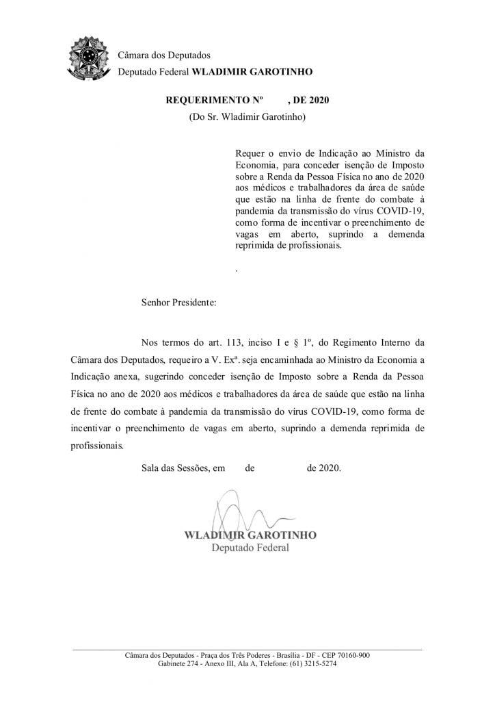 Deputado Federal Wladimir Garotinho faz indicação legislativa ao Ministro da Economia Paulo Guedes, para que seja encaminhada proposta ao Congresso Nacional afim de conceder isenção de Imposto sobre a Renda da Pessoa Física no ano de 2020 aos médicos e trabalhadores da área de saúde que estão na linha de frente do combate à pandemia da transmissão do vírus COVID-19, como forma de incentivar o preenchimento de vagas em aberto, suprindo a demanda reprimida de profissionais.