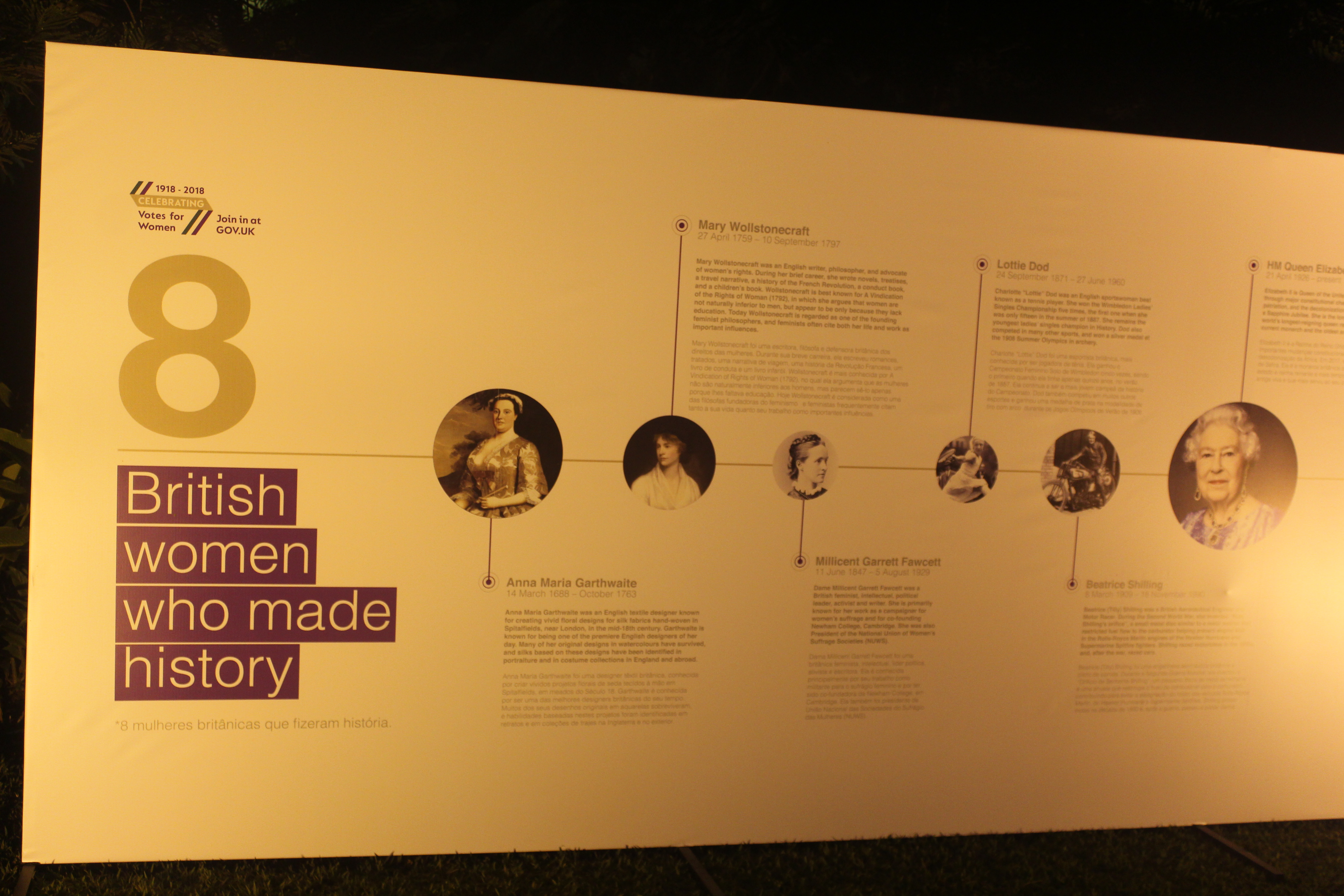 A embaixada trouxe a tona mais uma vez, a conquista centenária das sufragistas no Reino Unido. “O poder das mulheres tem tudo a ver com a realeza britânica. A nossa celebração comemora os 92 anos da rainha Elizabeth II, que é a Chefe de Estado mulher com mais tempo de trono do mundo e cujo reinado é o mais longo da história do Reino Unido”, declarou o embaixador Vijay Rangarajan. A Ministra Conselheira, Liz Davidson, destaca: “Em 2018 celebra-se os 100 anos do voto feminino no Reino Unido. No dia 6 de fevereiro de 1918, uma lei importante mudou a história do país. A chamada “Representation of the People Act 1918” (Ato de Representação do Povo de 1918) permitiu que (algumas) mulheres votassem pela primeira vez na vida”.