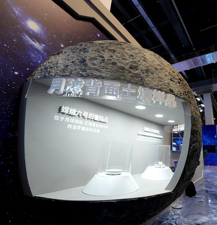 (250424) -- SHANGHAI, April 24, 2025 (Xinhua) -- Lunar soil samples collected from the far side of the moon are on display at the preview of a science exhibition marking the 10th Space Day of China at Shanghai World Expo Exhibition and Convention Center in east China's Shanghai, April 23, 2025. April 24 has been Space Day of China since 2016. The date marks the launch of China's first satellite "Dongfanghong-1" into space in 1970. Activities to mark the 10th Space Day of China will take place from April 24 to May 5 at the Shanghai World Expo Exhibition and Convention Center. (Xinhua/Zhang Jiansong)